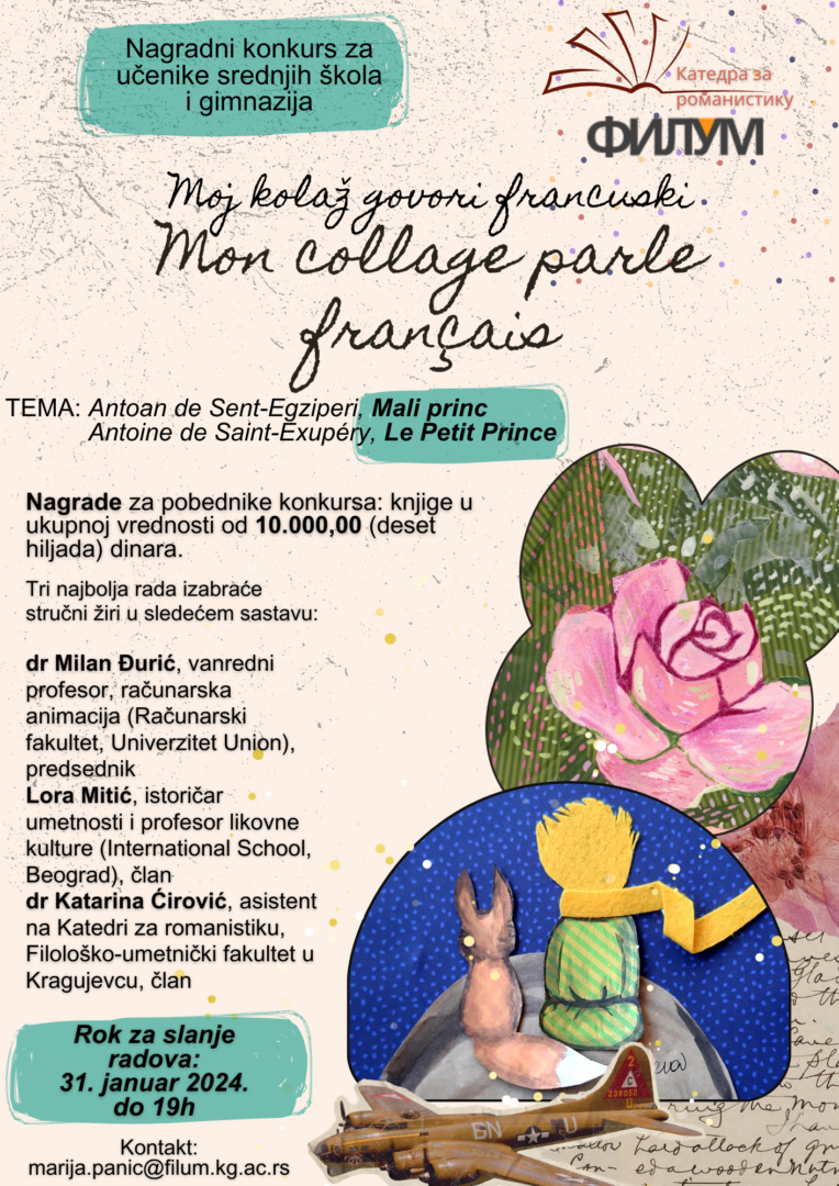 Pozivamo vas da učestvujete u nagradnom konkursu „Moj kolaž govori francuski“. Rok za slanje radova je 31.1.2024. a detalje konkursa možete pronaći u prilozima u nastavku. Sa željom da poslatih radova bude što više, srdačno vas pozdravljamo.